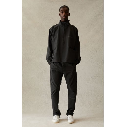FOG Essentialsブラックハーフジップジャケットは、ラグラン長袖、スタンドカラー付きのハーフジップフロントクロージャー、背面にEssentialsラバーブランドラベル、ドローストリングの裾が特徴です。