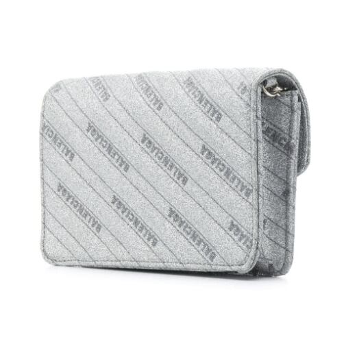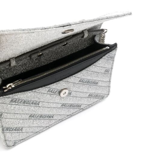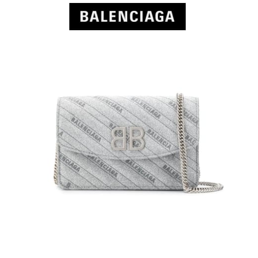 Balenciaga(バレンシアガ)の、BB チェーンウォレット。シルバートーンのチェーンショルダーストラップ、グリッターのディテール、マグネット付きの折りたたみ式開閉口、内側にファスナー付きポケット、シルバートーンの金具。