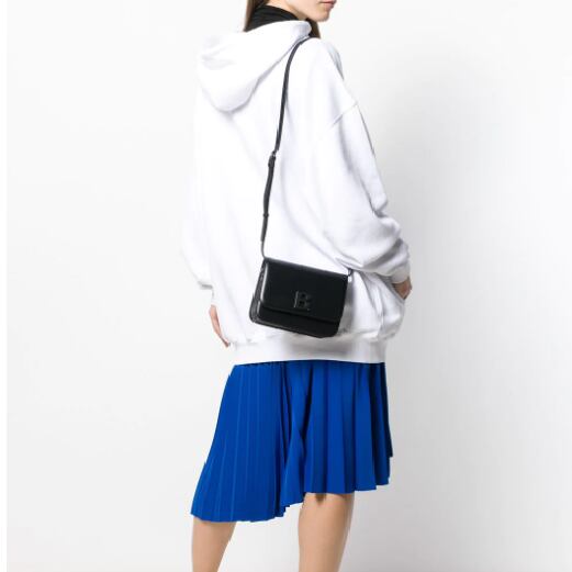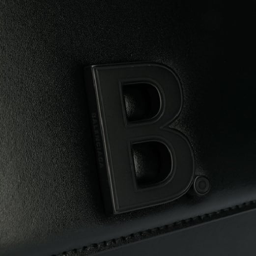 Balenciaga(バレンシアガ)の、B ショルダーバッグ(ブラック)。調節可能なショルダーストラップ、マグネット付きの折りたたみ式開閉口、アコーディオン構造の収納スペース、内側にファスナー付き収納ポケット、前面にロゴプレート。