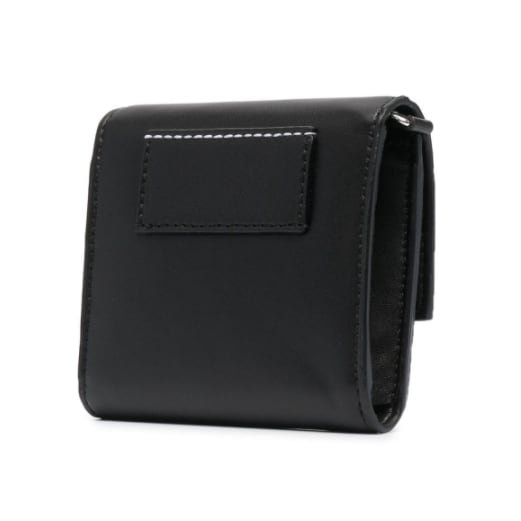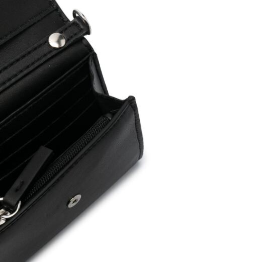 カレンダータグモチーフ、トーンオントーン ロゴ、チェーンストラップ、シルバートーンの金具、スナップボタン式クロージャー。ブラック。