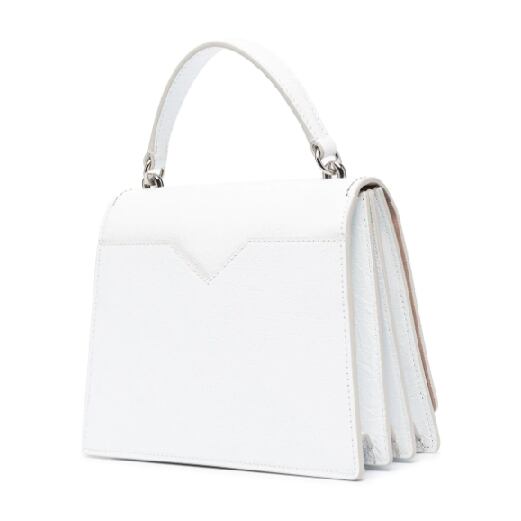 取り外し&調節可能なショルダーストラップ、ラウンドトップハンドル、同系色ステッチ、シルバートーンの金具、4ステッチ、フロントにフラップクロージャー、バックにスリットポケット、メインコンパートメント、スエードライニング、内側にロゴ、内側にジップポケット、内側にスリップポケット。ホワイト。