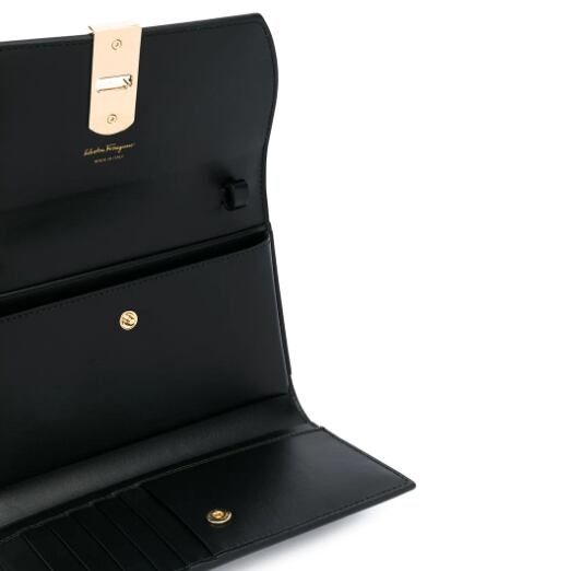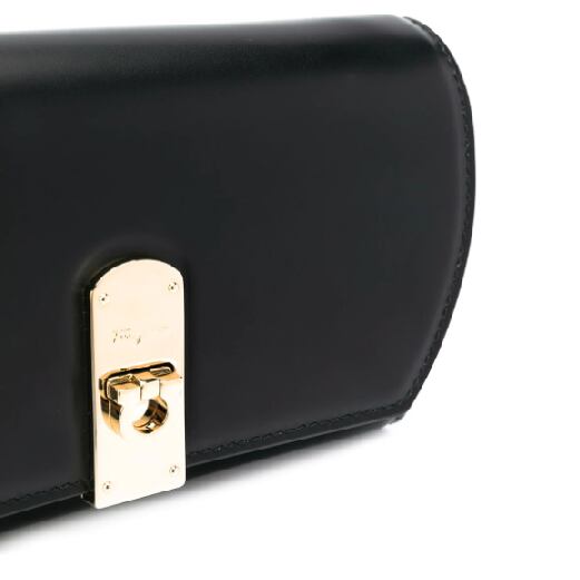 Salvatore Ferragamo(サルヴァトーレ・フェラガモ)の、ショルダーバッグ(ブラック)。斜めがけストラップ、ツイストロックの付いた折りたたみ式開閉口、ゴールドトーンの金具、プリントロゴ。