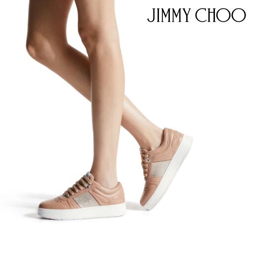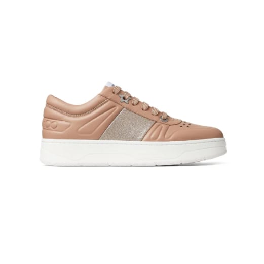 Ballet Pink カラーのカーフレザーを使用した、あらゆる装いにマッチするスニーカー、HAWAII/F。シルバートーンのスターアイレット、パーフォレーション、ヒールにあしらわれたジミー チュウのロゴをエンボス加工した控えめなディテールに加え、シンプルなシルエットに Ballet Pink カラーのグリッターストライプがアクセントとして煌めくスタイルです。脚のラインをスラっと見せるチャンキーなソール付き。