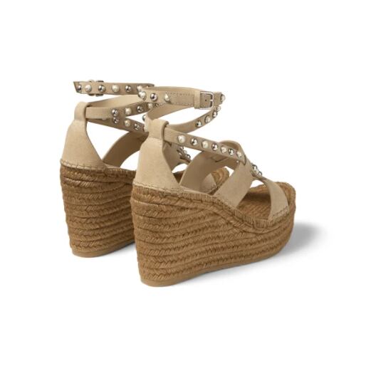 夏のワードローブに欠かせない、オープントゥのエスパドリーユウェッジサンダル。Sand Dune カラーのスエードを使用し、110㎜のウェッジヒールを取り入れた、実用性とデザイン性を併せ持つデザインです。抜群のフィットをもたらすバックルをあしらい、ブランドを象徴するグロッシーなホワイトパールとスタッズを飾って上品に仕上げました。