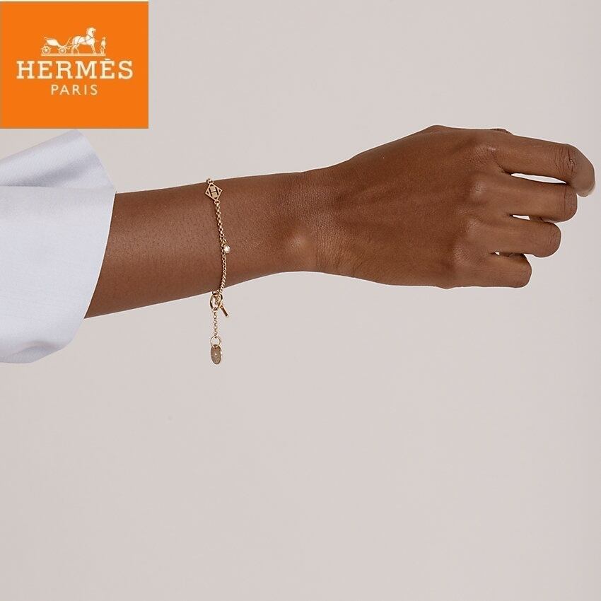 サドルネイルに2個のDeHダイヤモンドをセットし、ロッドリングを通過するピンクゴールドのブレスレット。ガンバードラインはエルメスのシンボルの間を行き来します。